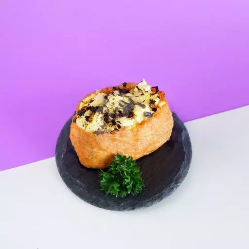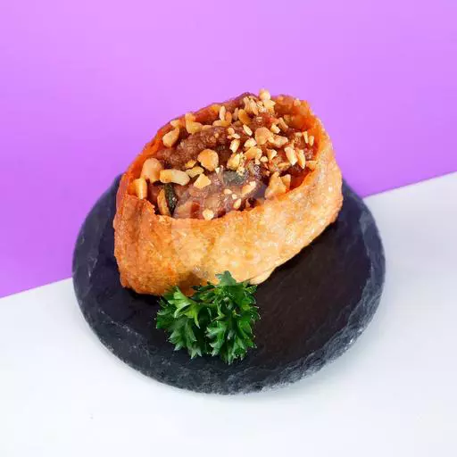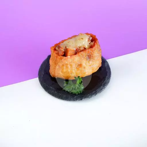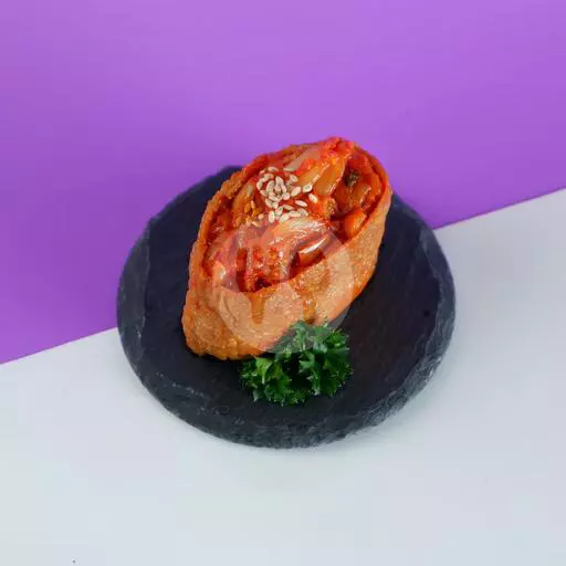 (1 pcs) Kulit tahu yang berisi nasi dengan potongan telur dan wortel kecil. Dengan topping Hot BBQ chicken.