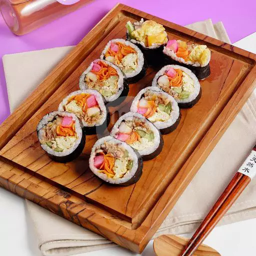 Kimbab berisi chicken cutlet, telur, wortel, timun, crab stick, lobak pink, tahu crispy, mayonaise dan kol. Pencinta ayam wajib coba.