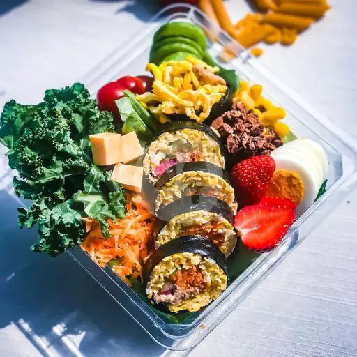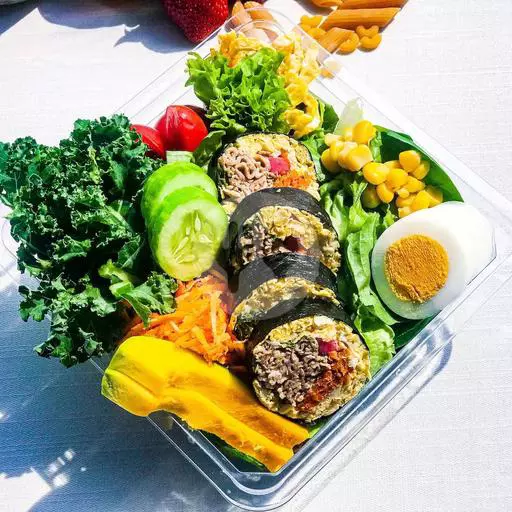 Romaine, Lettuce, Jagung, Wortel, Cherry Tomato, ½ Tuna Keto Kimbab, Kol, Saus Home Made. Gambar Hanya Sebagai Referensi.