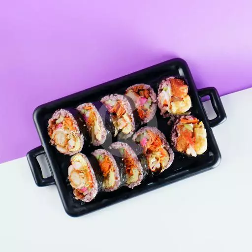 Kimbab berisi udang goreng tepung, telur, wortel, timun, crab stick, lobak pink, tahu crispy, mayonaise dan kol. Crispy di luar, lembut di dalam.