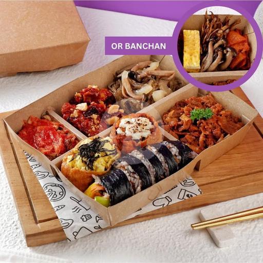 Bekal ala Korea berisi kimbab setengah porsi, Yubu 2pcs, pilihan main dish (ayam, sapi, ceker), pilihan extra dish (yangnyeom chicken, japchae, soy garlic chicken), tambahan side dish: kimchi, telur, odeng, mandu, salad. Disajikan dengan tambahan sup miyeok.