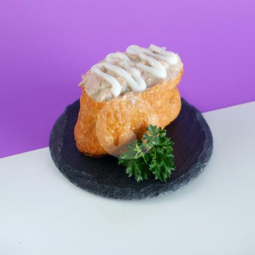 (1 pcs) Kulit tahu yang berisi nasi dengan potongan telur dan wortel kecil. Dengan topping tuna mayonaise.
