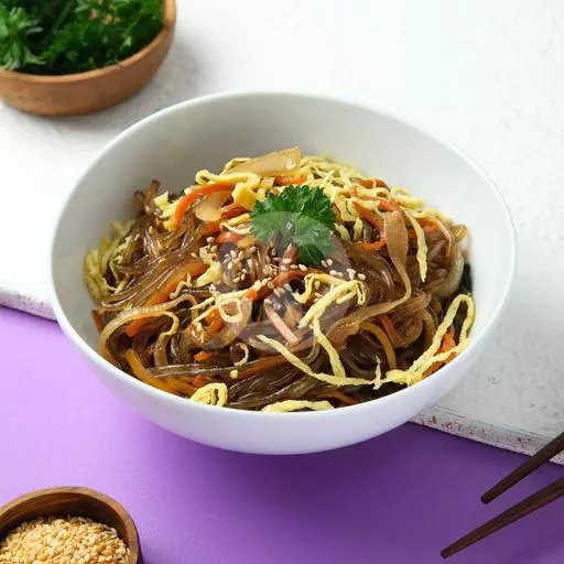Mie bihun Korea kenyal dengan daging sapi, wortel, jamur, dan telur iris, ditumis dengan saus kecap asin khas Korea & minyak wijen.