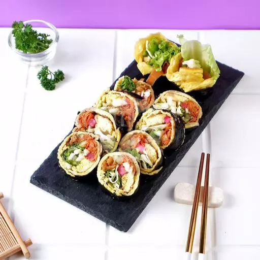 Kimbab asli Korea berisi telur, wortel, timun, gobo, crab stick, lobak pink dan tahu crispy. Porsi nasi sedikit, sayuran lebih banyak. Cocok untuk diet.