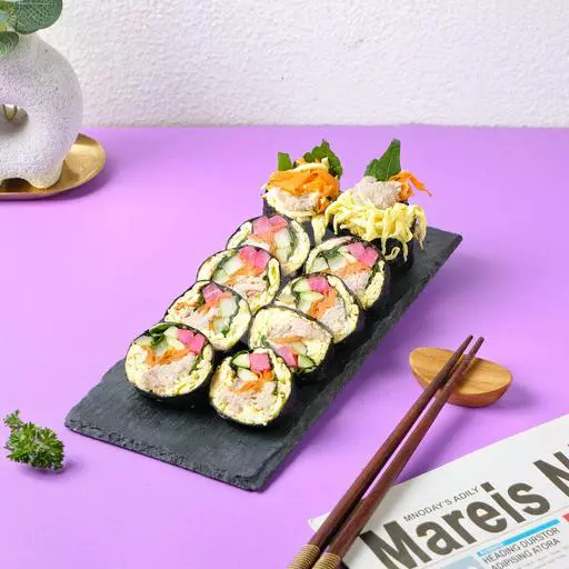 Kimbab rendah karbohidrat yang berisi telur iris, tuna, daun wijen, wortel dan lobak acar. Cocok untuk yang sedang diet keto atau DEBM. Estimasi 500 kalori.