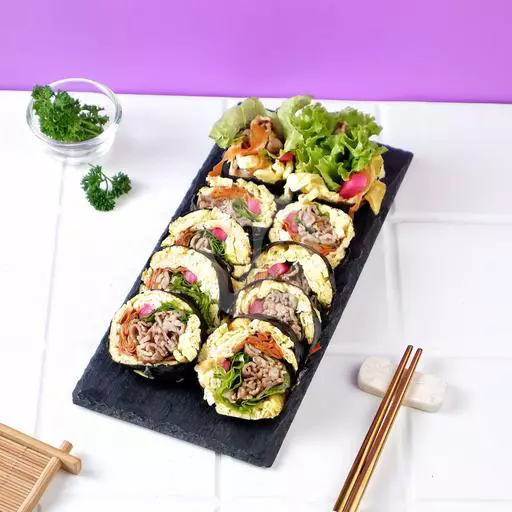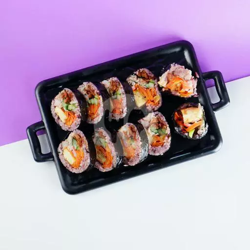 Kimbab berisi bulgogi, telur, wortel, timun, crab stick, lobak pink dan tahu crispy. Cocok untuk pencinta daging sapi.