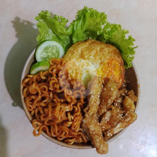 Mie Korea pedas, ayam teriyaki, telur goreng, segar sayuran.