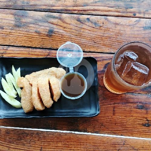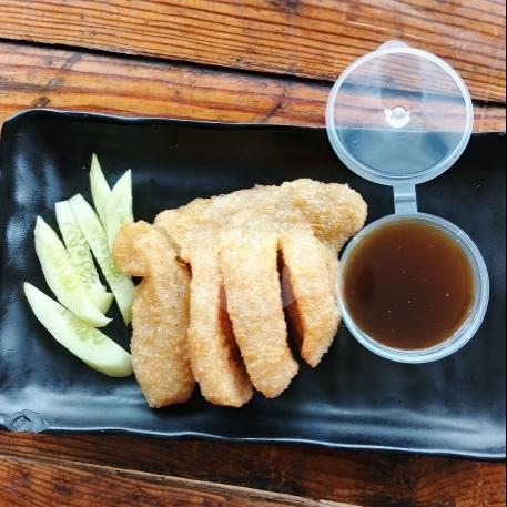 Pempek goreng renyah, disajikan dengan timun segar dan cuka khas es teh jus. ( Tambah Catatan Apabila Ingin di potong dan atau tidak di potong )