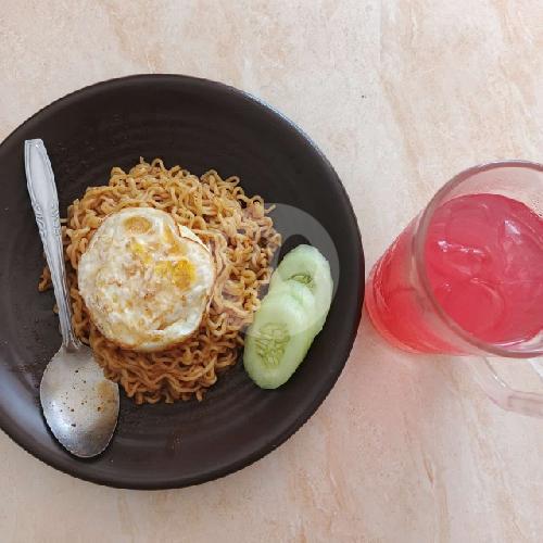 Mie Rendang dengan telur goreng dan irisan mentimun.