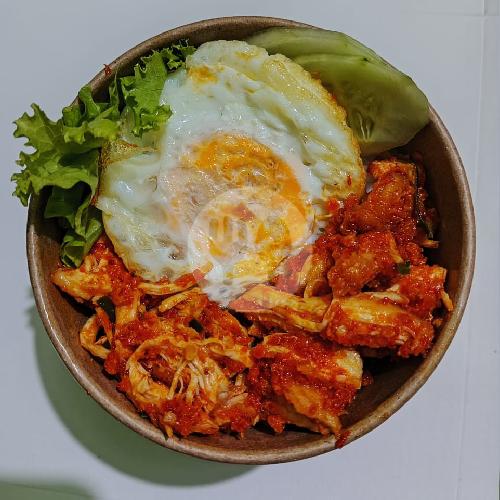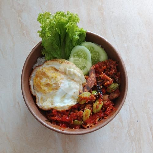 Bowl nasi dengan sambal cengkalang, telur goreng, dan sayur segar.