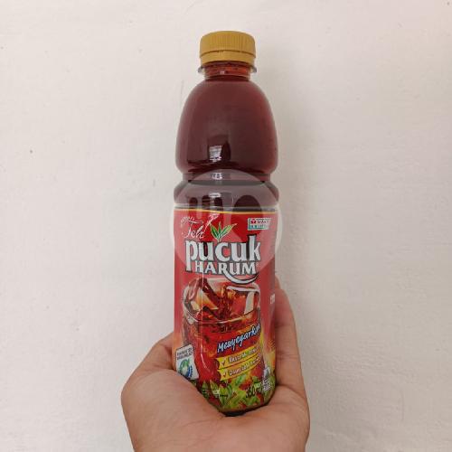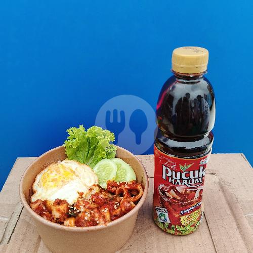 Cumi balado pedas, nasi, telur goreng, sayur segar, dan teh pucuk.