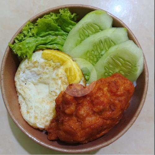 Ayam goreng daun jeruk, telur mata sapi, sayuran segar.dan salad sayuran