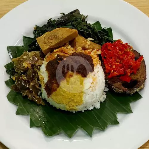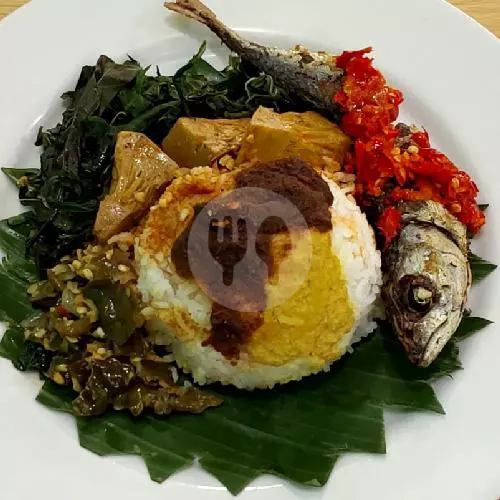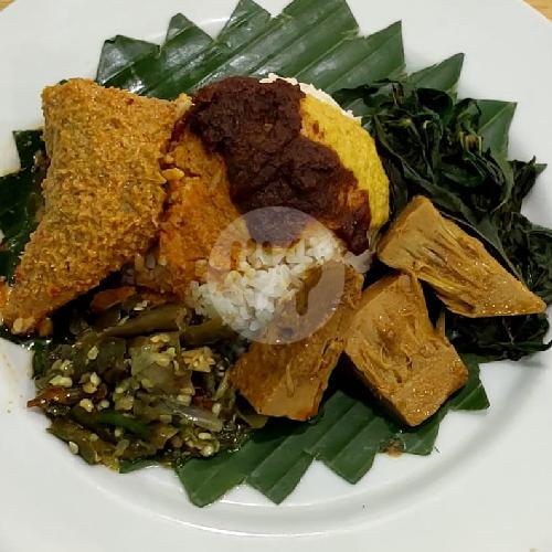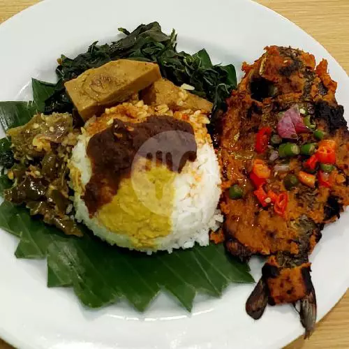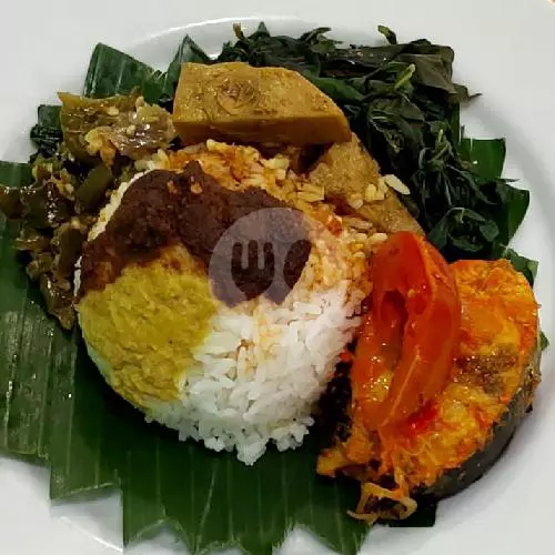 Nasi Padang, Ikan Kembung Bakar, Gulai Nangka, Daun Singkong, Kuah Gulai, Sambel Ijo, Bumbu Rendang.