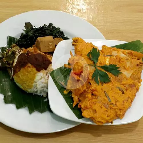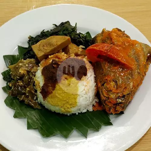 Nasi Padang, Kepala Tongkol Sampadeh, Gulai Nangka, Daun Singkong, Kuah Gulai, Sambel Ijo, Bumbu Rendang.