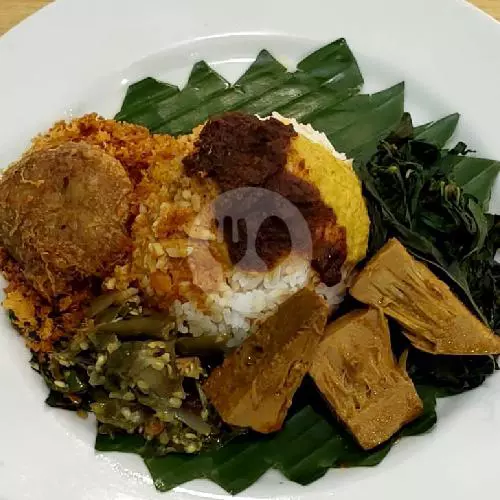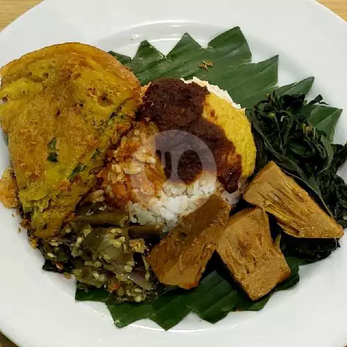 Nasi Padang, Pergedel Kentang, Gulai Nangka, Daun Singkong, Cabe Ijo, Bumbu Rendang