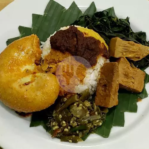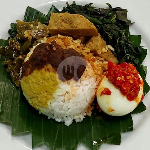 Nasi Padang, Telur Balado Cabe Merah, Gulai Nangka, Daun Singkong, Kuah Gulai, Sambel Ijo, Bumbu Rendang.