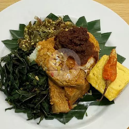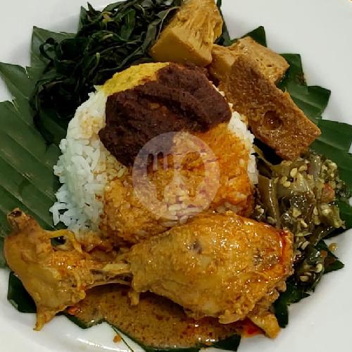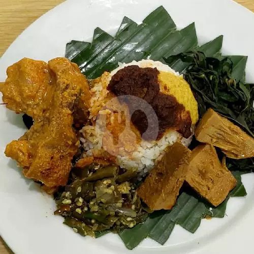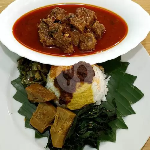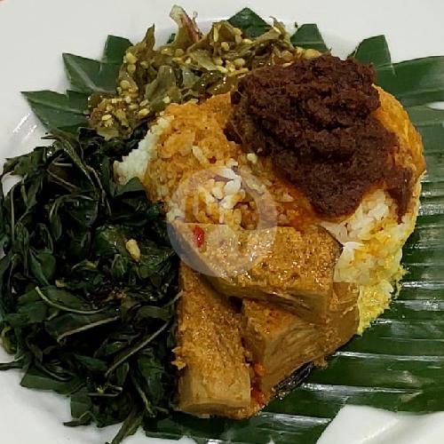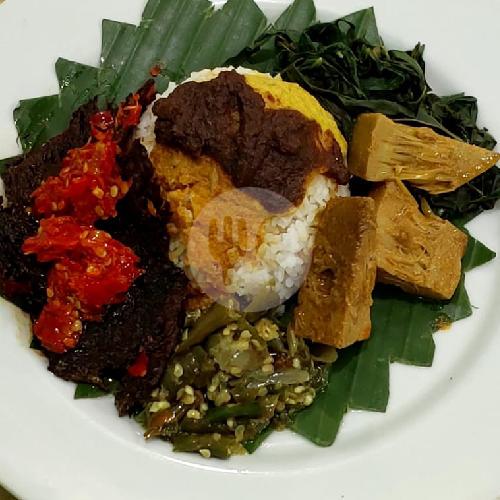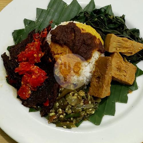 Nasi Padang, Rendang Daging, Gulai Nangka, Daun Singkong, Kuah Gulai, Sambel Ijo, Bumbu Rendang.
