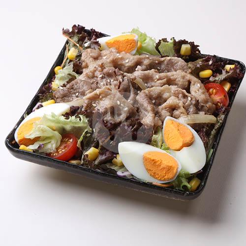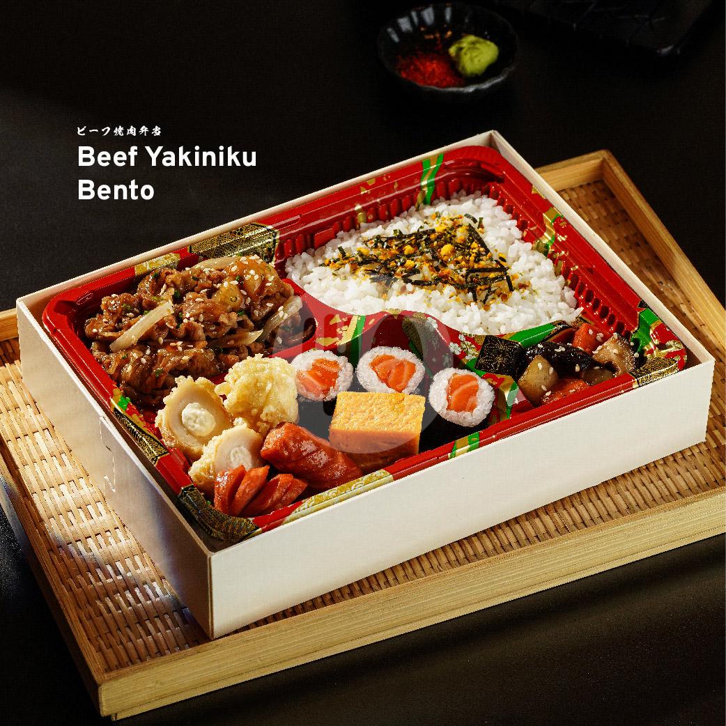 A complete set Beef Yakiniku Bento with furikake rice, beef sausage, chikuwa cream cheese, tamago sashimi, salmon maki, and sautéed vegetables.