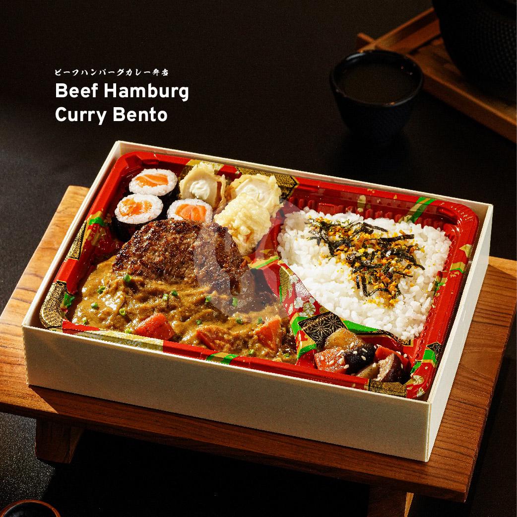 A complete set Beef Hamburg Curry Bento with furikake rice, chikuwa cream cheese, salmon maki, and sautéed vegetables.