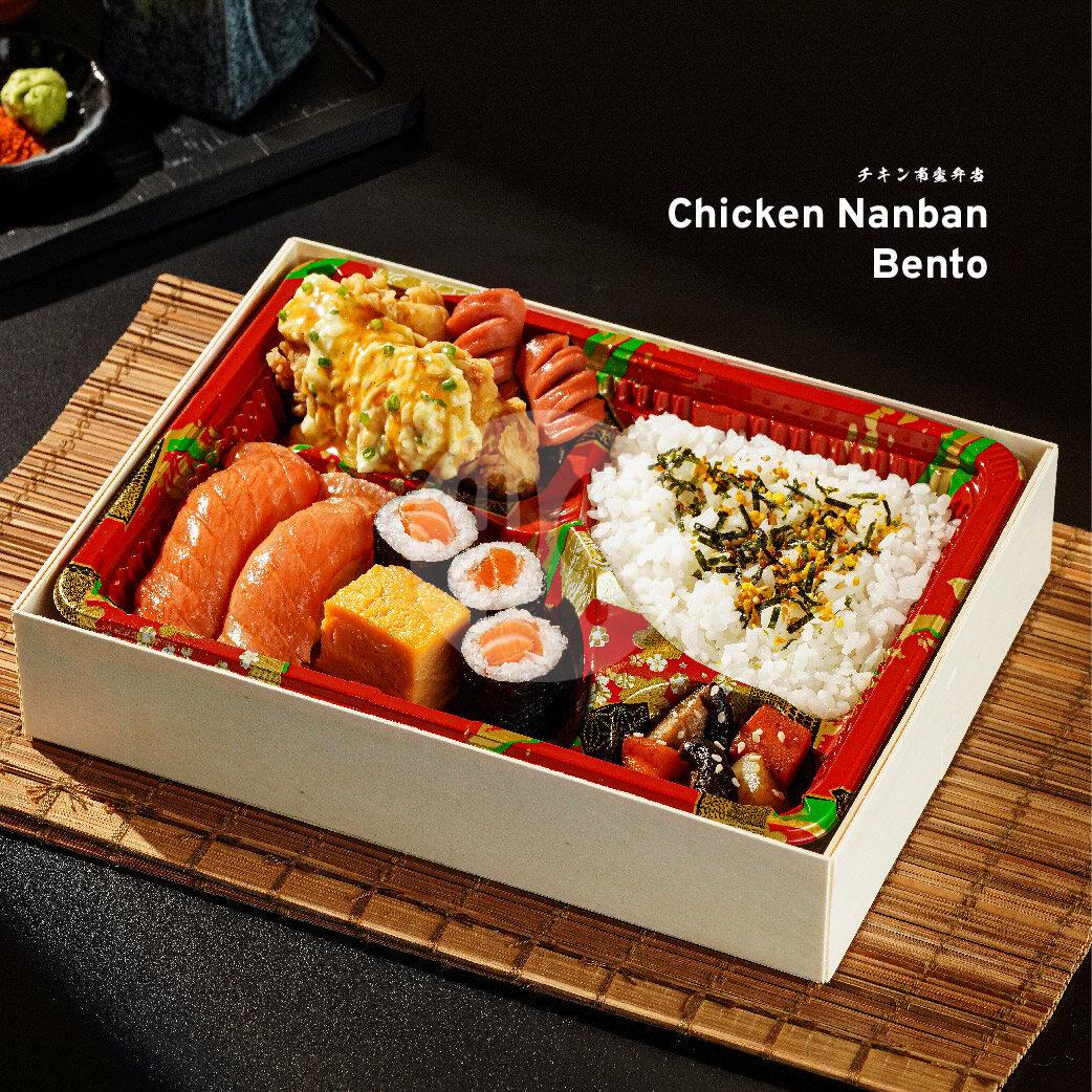 A complete set Chicken Nanban Bento with furikake rice, beef sausage, aburi salmon sushi, tamago sashimi, salmon maki, and sautéed vegetables.