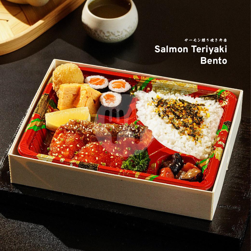 A complete set Salmon Teriyaki Bento with furikake rice, chicken cream croquette, tamago sashimi, salmon maki, and sautéed vegetables.