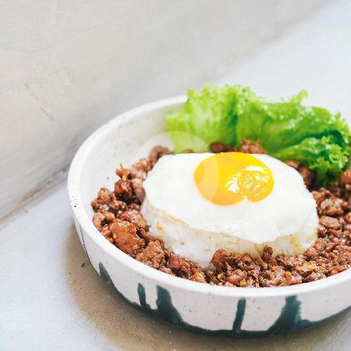 Tender beef slice and fluffy pile of rice topped with fresh sambal matah and creamy sunny side up.