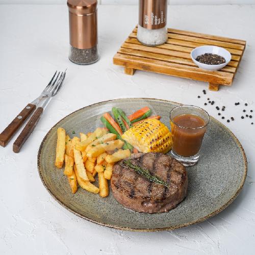 Steak Daging Sapi Disajikan Dengan Wortel, Buncis, Jagung Dilengkapi Dengan Pilihan Kentang Dan Saus Steak