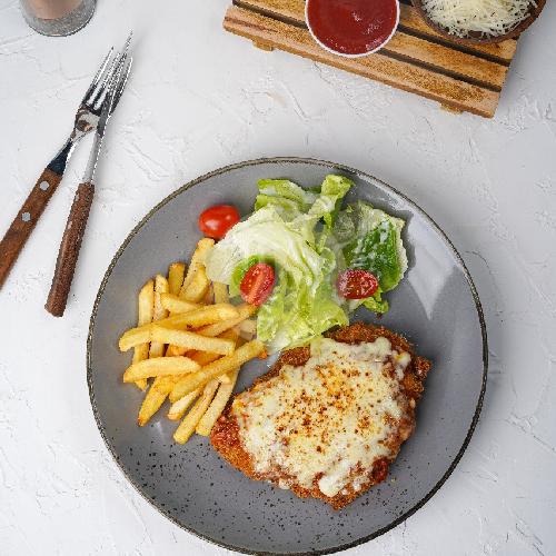 Ayam Fillet Goreng Tepung Dengan Saus Concase Dan Lelehan Keju Mozarella. Disajikan Dengan Salah Dan Pilihan Kentang