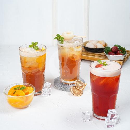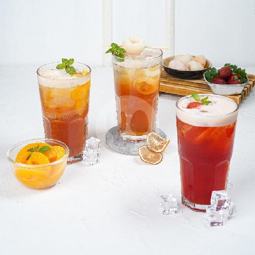 Es Teh Dengan Rasa Strawberry dan Irisan Buah Strawberry