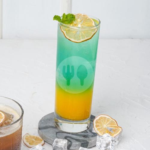 Soda Dengan Rasa Leci Dan Jeruk Dicampur Dengan Sirup Curacao