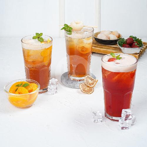 Es Teh Dengan Rasa Peach dan Tambahan Buah Peach Atau Persik