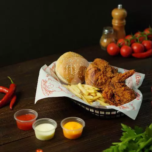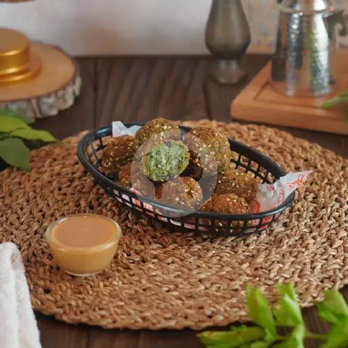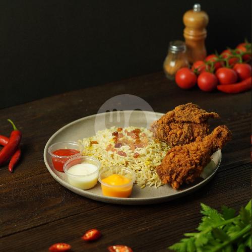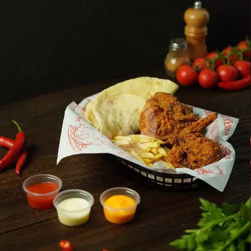 Herbs Chicken Khas Kebuli Tarim, Roti Khubus (Pita Bread), French Fries, Garlic Mayo, dan Saos Sambel