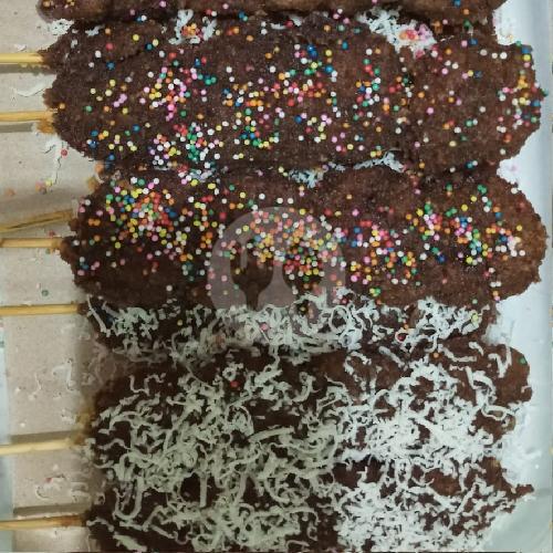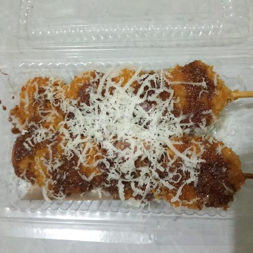 terbuat dari pisang dilapisi tepung roti dan ditaburi susu coklat dan keju ( Isi 2 Tusuk )