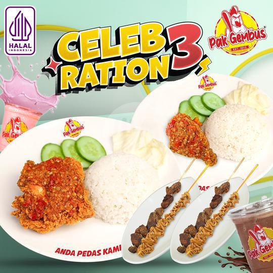Nasi (2) + ayam crispy dada/paha atas (1) + ayam crispy sayap/paha bawah (1) + sambal (2) + lalapan (2) + sate usus/kulit/ati ampela (4) + gembus orange/lemon tea/lychee tea/milky melon/milky choco (2)