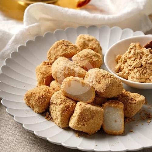 1 porsi warabi mochi yang sangat kenyal, lembut, dan khas harumnya, berisi 15 bites mochi premium yang ditaburi dengan kinako atau bubuk kedelai panggang home made dan fresh. Sangat nikmat dimakan dengan saus gula aren