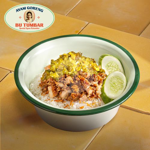 Nasi dengan potongan ayam tepung penyet bumbu ketumbar yang harum dilumuri sambal spesial khas Bu Tumbar yang gurih dan pedas!