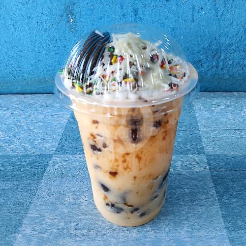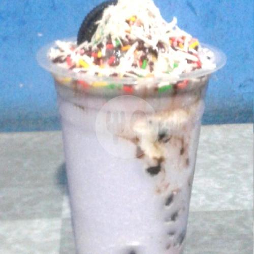 Dengan toping (boba agar biscuit oreo mesis warna keju susu )