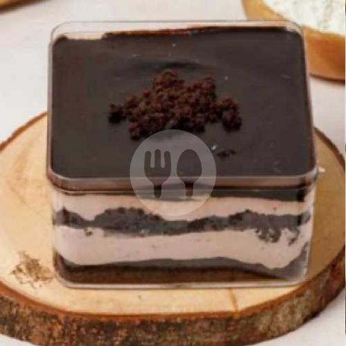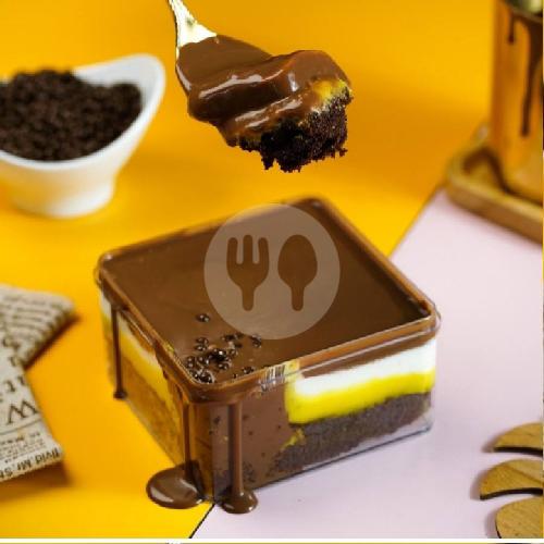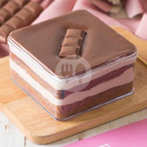 Dessert box cadbury dengan sponge cake moist + cream coklat keju + cokelat cadbury ganache + toping coklat cadbury.