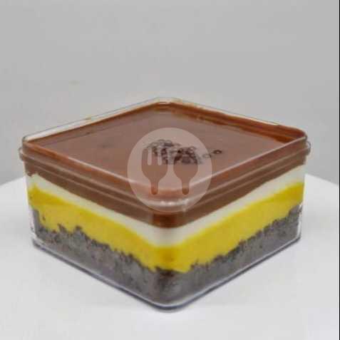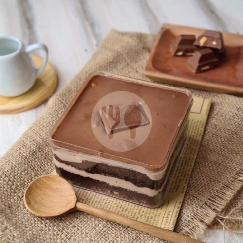 Dessert Box Cake Tiramisu Dengan Cream Tiramisu Di Tambah Cream Keju Di Tambah Taburan Cocoa Powder Di Atas Nya.