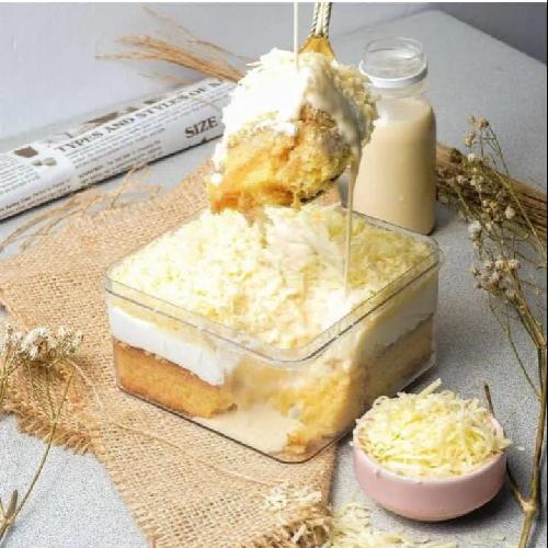 Ciffon Cake Vanila Di Padu Dengan Cream Vanila Dengan Toping Keju Yang Melimpah + Siraman Susu Terpisah Yang Di Kemas Dalam Botol