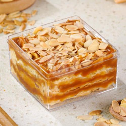 Inovasi Baru Pastry Di Kemas Dalam Box Dengan Paduan Carame Yang Lezat Dan Almond Yang Melimpah. Ukuran 10.5 x 10.5 x 6 Cm.