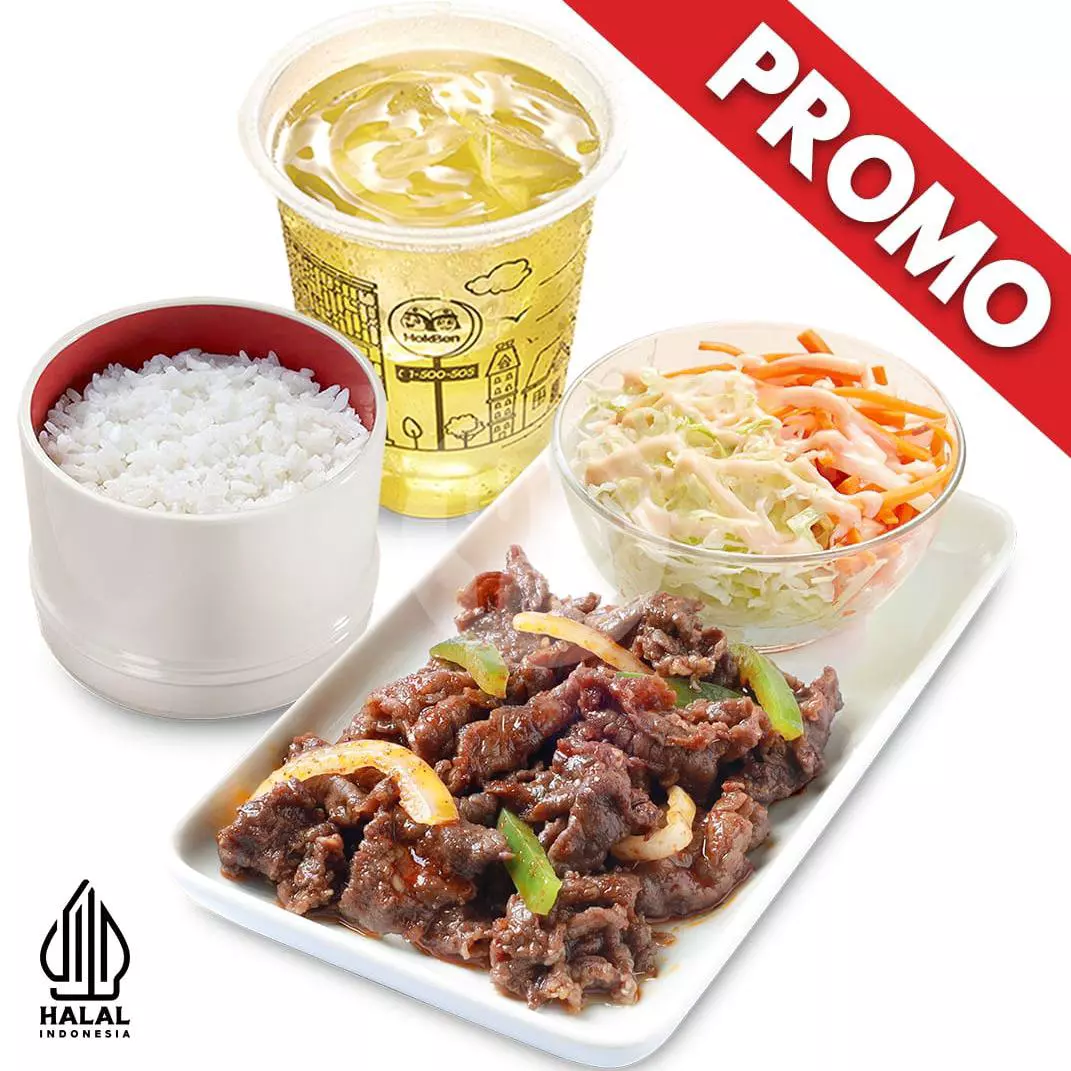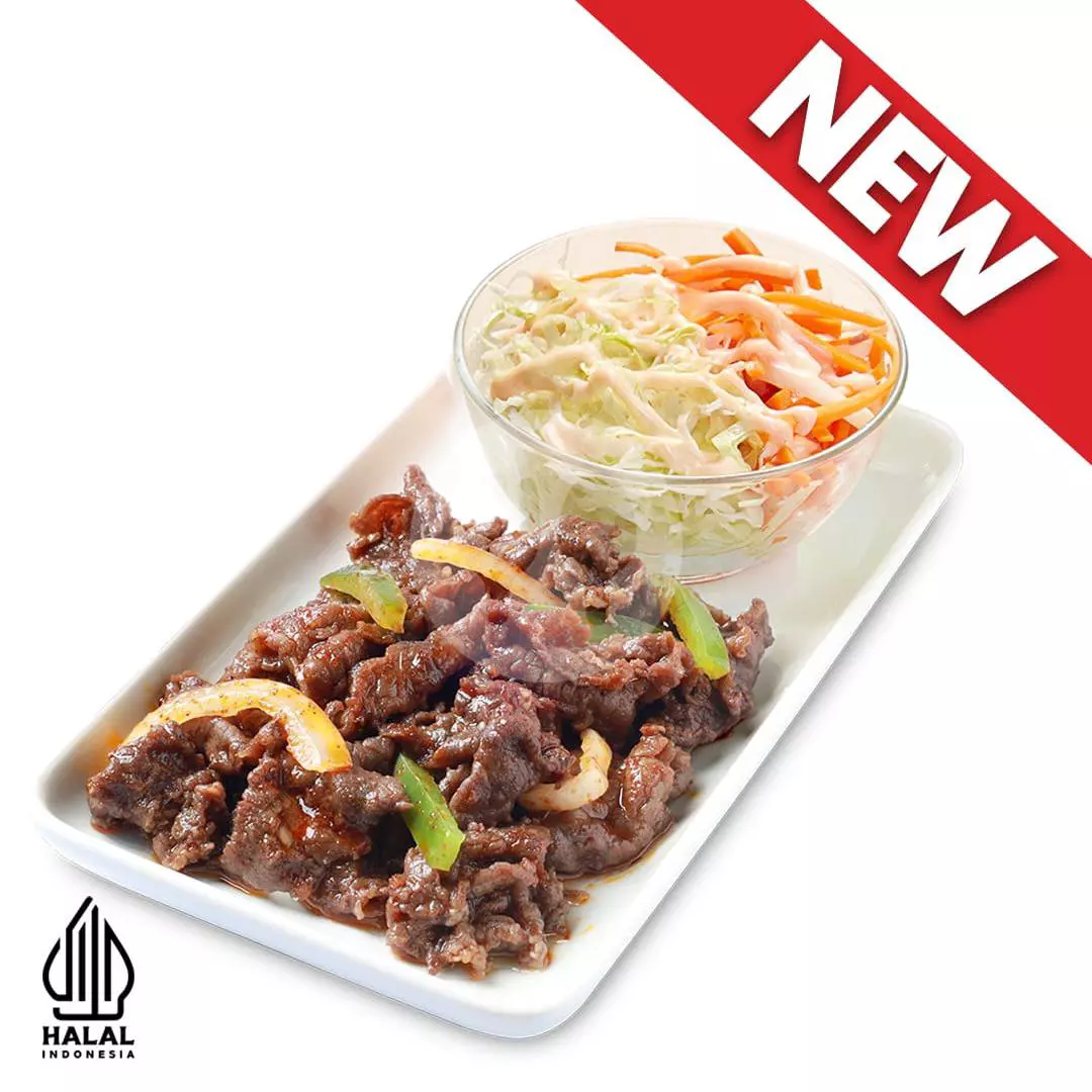 Daging sapi premium yang dimasak dengan potongan bawang bombay dan irisan cabai yang dibumbui menggunakan saus teriyaki khas HokBen dengan citarasa pedas