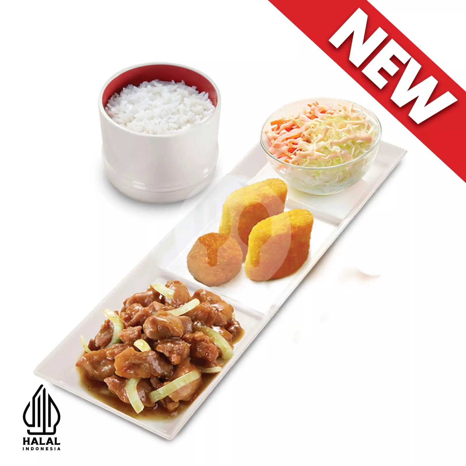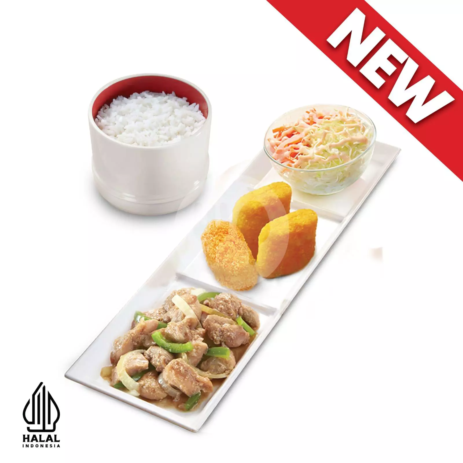 Daging ayam tanpa tulang yang dimasak dengan potongan bawang bombay dan irisan cabai yang dibumbui menggunakan saus teriyaki khas HokBen dengan citarasa pedas