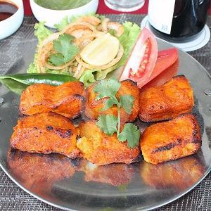 Chunks of paneer wrapped in spicy batter and glazed in clay oven with capsicum, onion & tomato