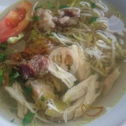 Soto ayam kuah bening tanpa santan dengan isian sohun, kol, toge, tomat ditabur irisan ayam goreng, seledri dan bawang goreng