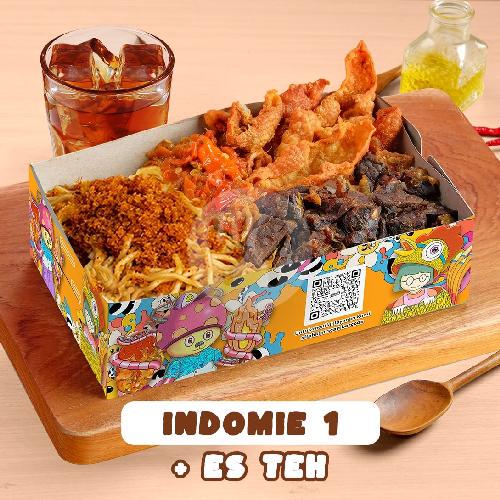 Indomie Goreng Kulit dipadukan dengan Ayam, Serundeng/Kremes serta Sambal + Es Teh