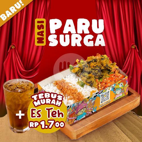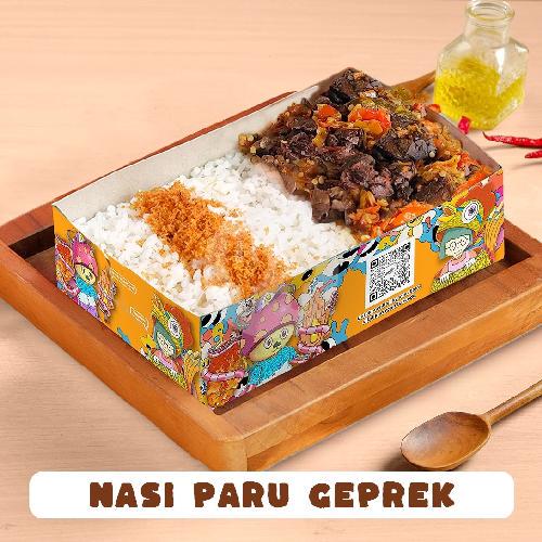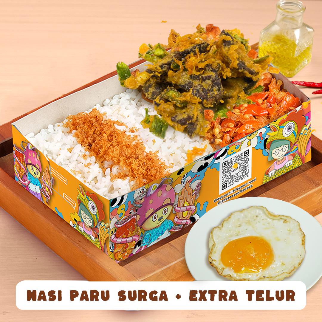 Nasi dipadukan dengan paru crispy serta topping kremes + sambal bawang + ekstra telur
