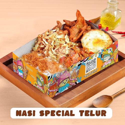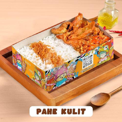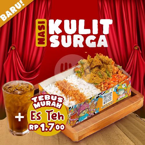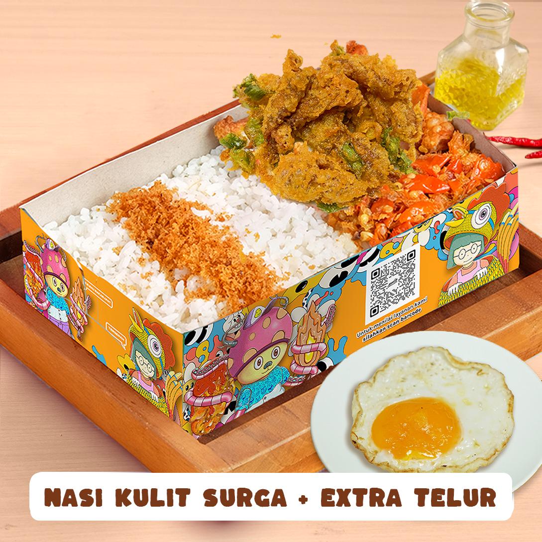 Nasi dipadukan dengan kulit ayam crispy serta topping serundeng + sambal bawang + ekstra telur