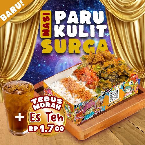 Nasi kulit bumbu rempah dipadukan dengan paru, serundeng/kremes serta sambal + Es Teh
