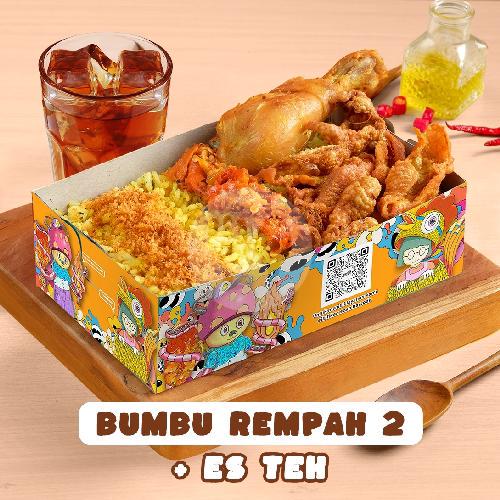 Nasi kulit bumbu rempah dipadukan dengan ayam, serundeng/kremes serta sambal + Es Teh